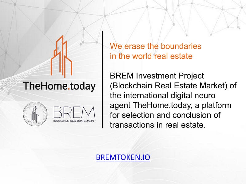 The BREM Investment Project (Blockchain Real Estate Market) from the international digital neuro agency TheHome.today, a platform for selection and conclusion of transactions in real estate.